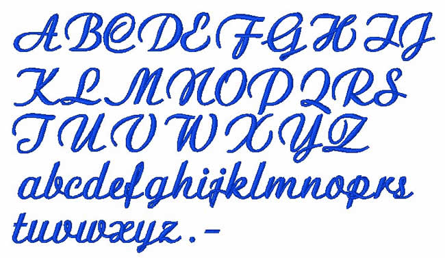 スタンダードな筆記体刺繍フォントです。太さなどのバランス良く、ネーム入れに、また大文字1文字なども良いです。 |